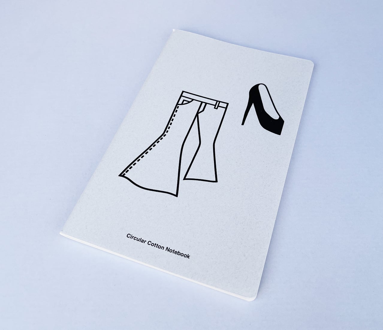 世界中で出されるゴミの約14%は繊維のゴミだと言われています。毎年137万トンの繊維の廃棄物が捨てられたり燃やされています。これまで廃棄されていた洋服の廃棄物とパルプを組み合わせて開発されたのがサーキュラーコットンペーパーという紙です。繊維の廃棄物を繊維に再生した場合、日本におけるリサイクル率は17.5 %、それに比べ紙の回収率は85% 、古紙利用率は67%と高い循環利用となります。しかもこの紙は最終的に土に返る性質を持っています。このサーキュラーコットンペーパーを活用し、「服」をテーマにノートをつくりました